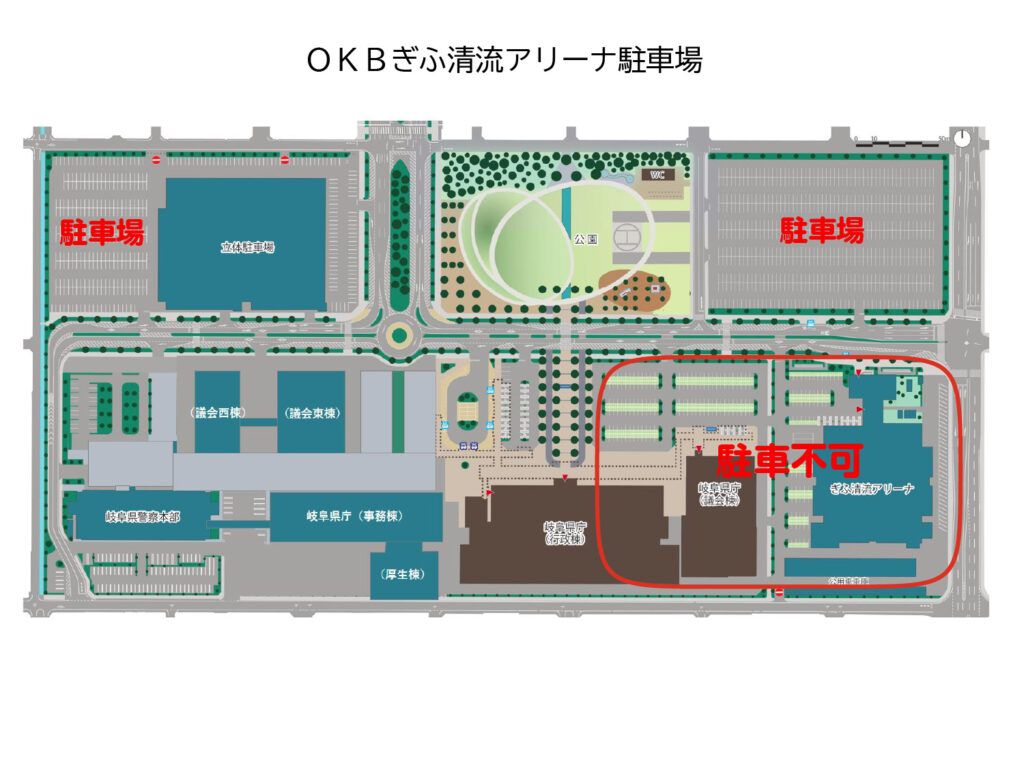 OKBぎふ清流アリーナ周辺(上記駐車場図 一帯)は、県の施設及び敷地となっていますので、『全て禁煙』です。
